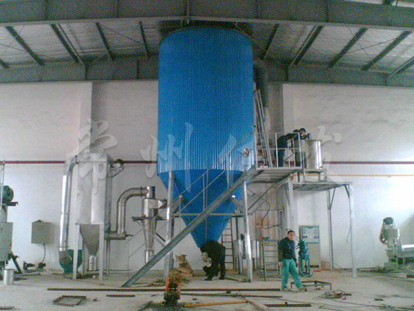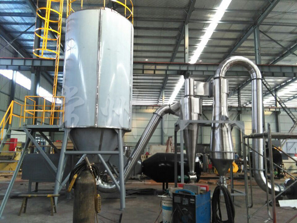 本機是將料液壓入壓力噴嘴霧化成微小霧滴,在塔內(nèi)與熱風以對流的方式完成干燥,獲得顆粒產(chǎn)品。