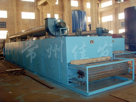 物料由加料器均勻地鋪在網(wǎng)帶上,網(wǎng)帶一般采用12-60目不銹鋼絲網(wǎng),由傳動裝置拖動在干燥機(jī)內(nèi)移動。干燥機(jī)由若干單元組成,每一單元熱風(fēng)獨(dú)立循環(huán),部分尾氣由專門濕風(fēng)機(jī)排出,廢氣由調(diào)節(jié)閥控制,熱氣由下往上或由上往下穿過鋪滿物料的網(wǎng)帶完成熱量與質(zhì)量傳遞的進(jìn)程,帶走物料的水份。網(wǎng)帶緩慢移動,運(yùn)行速度可根據(jù)物料溫度自動調(diào)節(jié),干燥后的成品連續(xù)落入收料器中。上下循環(huán)單元根據(jù)用戶需要可靈活配備,單元數(shù)量亦可根據(jù)需要選取。